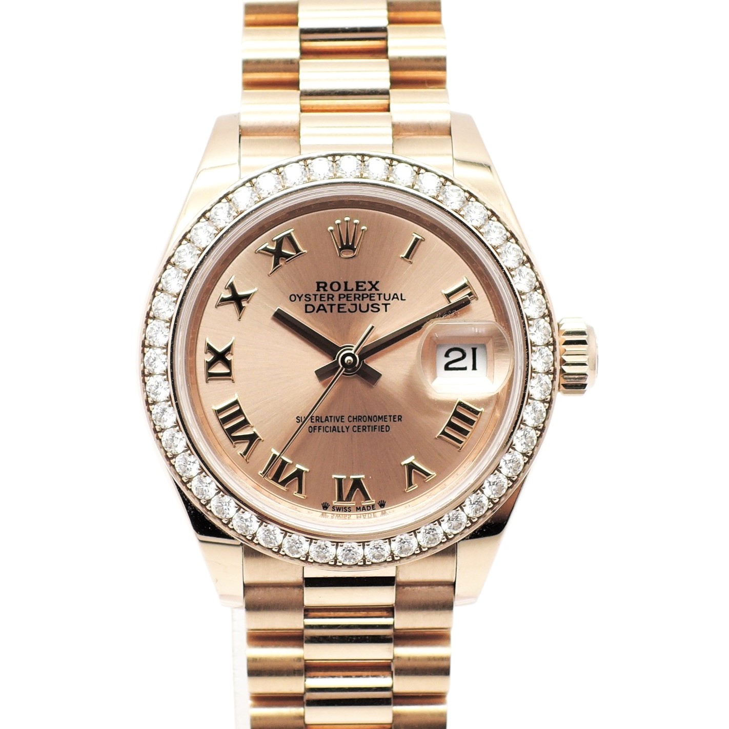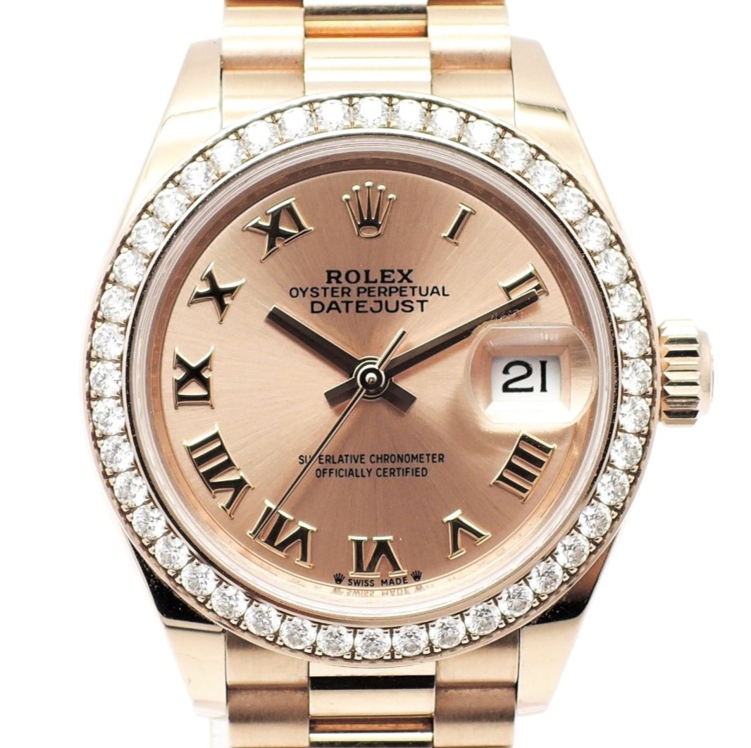 ピンクローマン文字盤にダイヤモンドベゼルをあしらった仕様は、晴れの日にふさわしい華やかさを演出します。